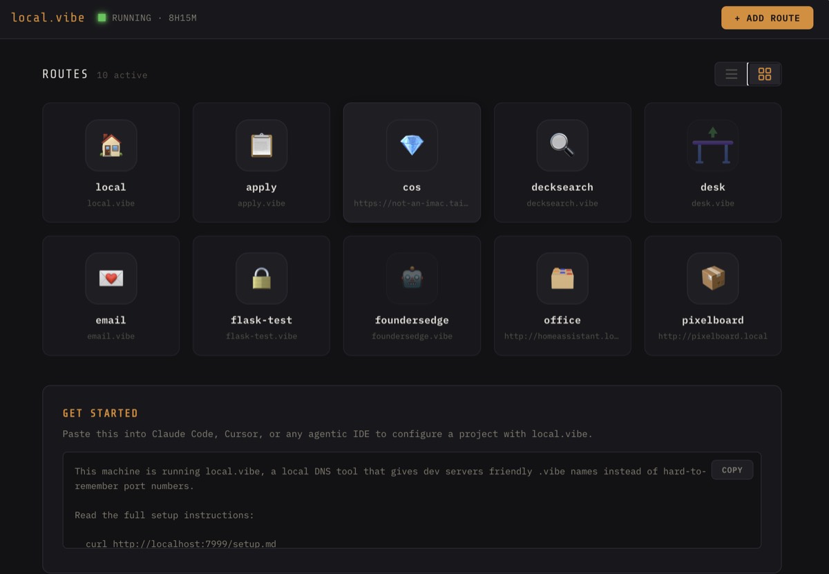 Paste that into Claude Code or Cursor and the agent understands your local.vibe setup. It can register new routes, check what’s running, start and stop apps via the HTTP API. That turned out to be a genuinely useful integration to get projects onboarded quickly.